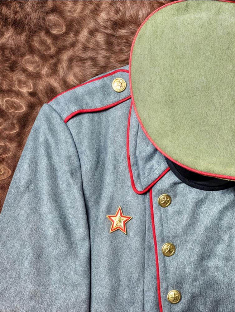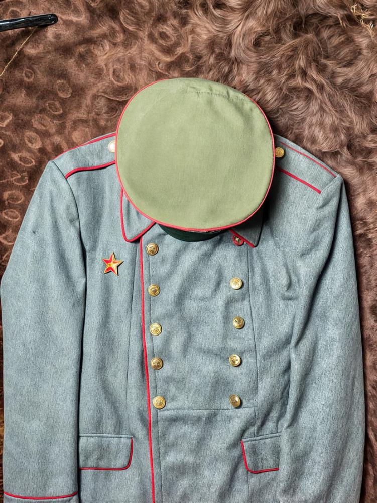اللون: رمادي فولاذي، مع خطوط بارزة باللون الأحمر على الياقة والأكمام والجيوب، تعكس طابع الجيش السوفيتي